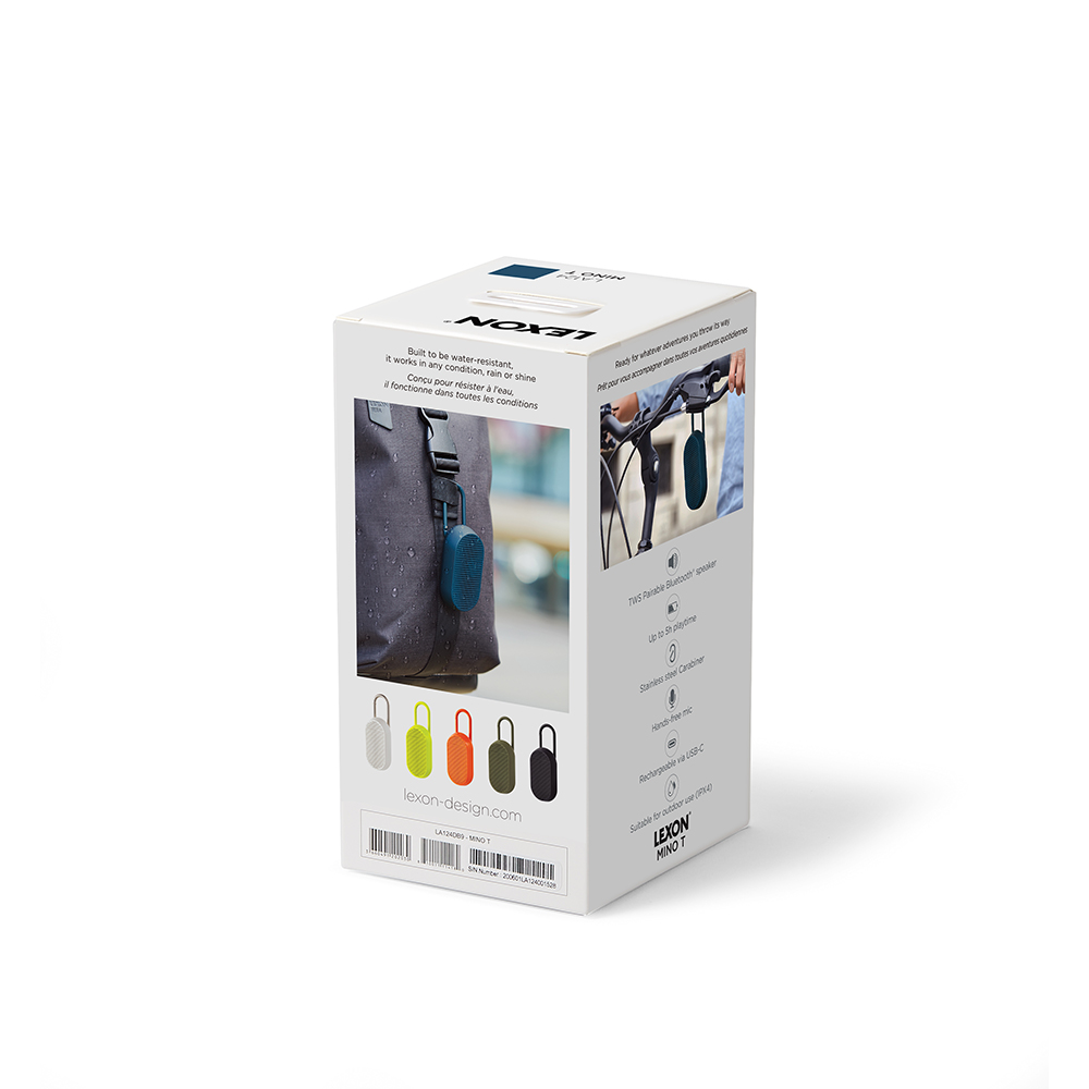 アクティブな使用に合わせてデザインされ、内蔵カラビナでバッグや自転車、ギアに簡単に取り付けられるため、いつでも音楽を手元で楽しめます。スタイリッシュでモダンなデザインのMino Tは、アウトドアだけでなく、インテリアとしてもお部屋に自然に溶け込みます。